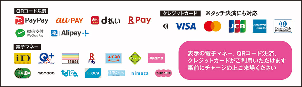 メニューをご購入の際は、会場内で販売する食券(700円/枚、100円/枚)と、下記の電⼦マネー、QRコード決済、クレジットカードが使用できます。